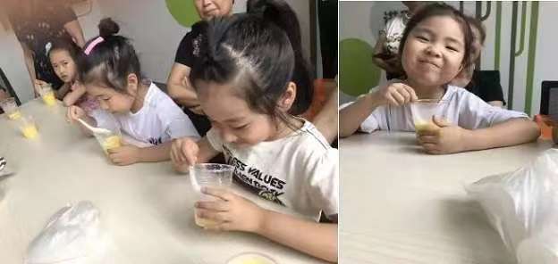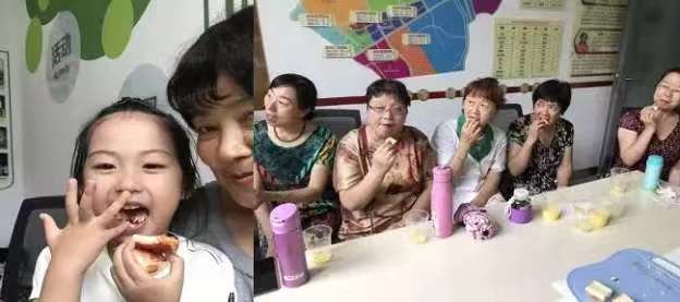 现场,在孩子们翘首以盼的目光里,在阿姨们表达美好生活的歌曲中,在美食老师的精心制作下,一杯一杯香气四溢的的玉米汁和一片片夹着老师制作的桃酱、西红柿酱的面包片呈现在了大家面前。孩子们迫不及待地要尝一尝。