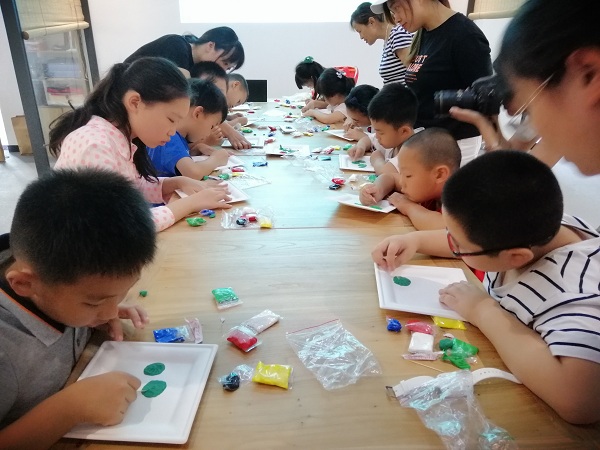 下午进入活动手工制作环节,大家依旧热情高涨、积极参与。老师先也给孩子们介绍了陶泥、手工布画的历史背景和文化传承,并留给大家充分的时间发挥自己的想象力来制作自己的手工作品。按照老师的讲解,精心细心的制作自己荷花陶泥作品,红的、白的的荷花映衬在翠绿色荷叶中,还不时有小鱼、青蛙来凑热闹,大家的作品主题统一,但各有特色。接下来的布画制作,也是惊喜不断。根据图画,剪纸、裁布、黏贴,每一个步骤都认真投入,并自己发挥,用自己喜欢的布料勾勒出长颈鹿、大狮子、小狗等,制作出的布画各有特色。