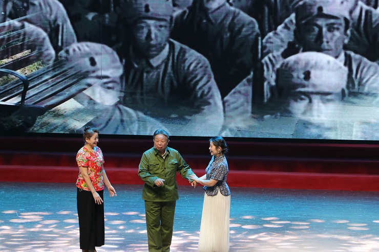三位居民带来精彩的情景剧表演《今夜星光灿烂》,讲述了退伍老兵参加战役、见证中华人民共和国成立,再现了与共和国共同成长的故事,真挚的情感感动了现场观众,大家纷纷表示,一定要发扬老一辈的革命传统,争取更大的光荣。