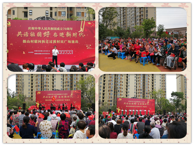 金秋送爽,丹桂飘香,在这万众欢腾、神州共庆的时刻,我们又以高昂的热情迎来了祖国70周年的光辉华诞。摄山村社区居民学校和党总支心系在外过渡的村民,9月26日下午,将慰问拆迁过渡村民广场演出的舞台搬进了过渡村民居住集中点——摄山星城晶都茗苑小区,数百名党员群众欢聚一堂,共庆祖国七十华诞。