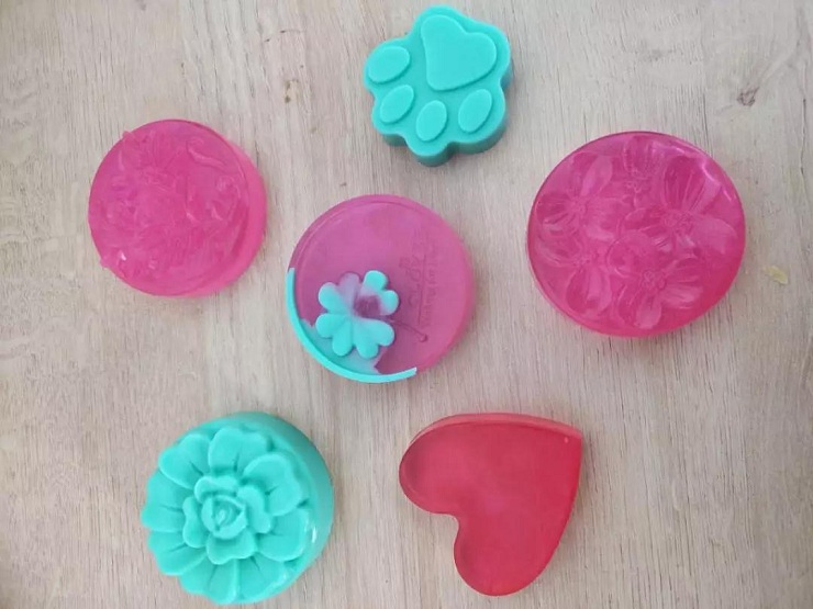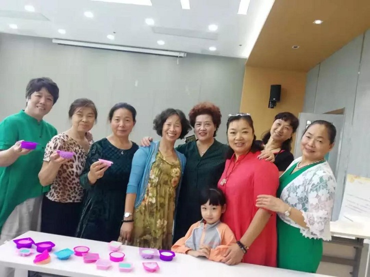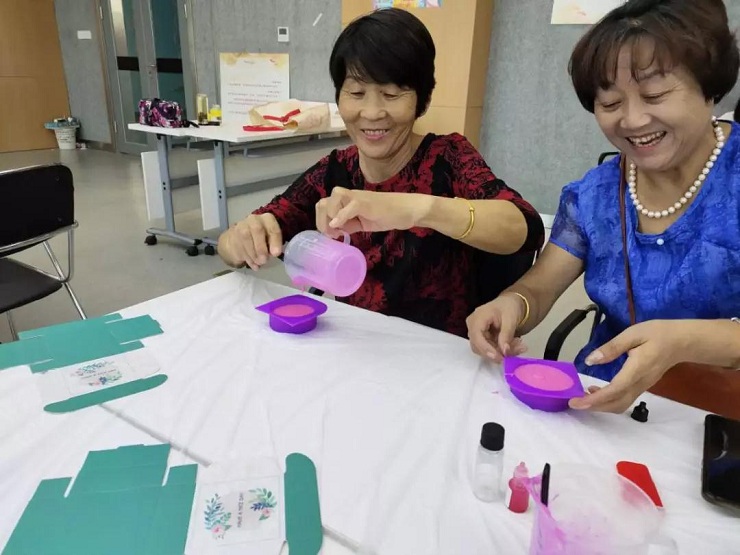大家忙得不亦乐乎,有的居民喜欢卡通模具,有的喜欢爱心模具,还有的喜欢萌萌的小爪子模具,大家互帮互助,按照老师教的方法和步骤,发挥想象,自由创作,做出了很多精致漂亮的手工皂。