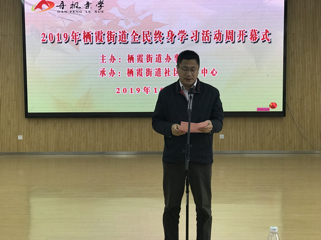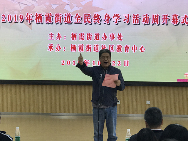 栖霞区社区培训学院院长王广胜为栖霞街道全民终身学习周开幕式致贺词。王院长为其一年来取得的新成绩点赞!他期望栖霞街道社区教育中心再接再厉,继续做实做强“丹枫乐学”品牌项目,使其成为栖霞区社区教育的一张靓丽名片,为全民终身学习再立新功!王广胜院长宣布:2019年栖霞街道全民终身学习活动周开幕!此时,热情豪迈的《学习之歌》在会场响起,2019年栖霞街道全民终身学习活动周开幕式圆满结束。