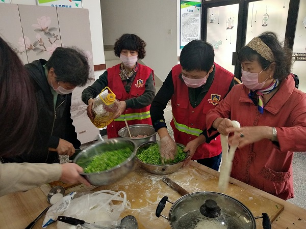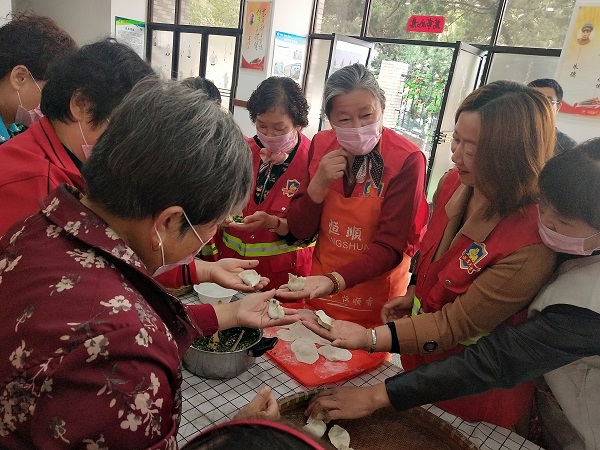 下午1时,巾帼志愿者们就开始忙碌起来,和面、擀面皮、切菜、拌馅子,分工有序,确保下午的活动正常运行。人多力量大,家庭主妇门个个都是包饺子的能手,很快就让请来的老人吃上了热腾腾的饺子。