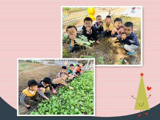 幼儿们走到种植园地,激动地说;“你看菜已经长大了,明天就可以吃啦。”走到银杏树下,又被银杏果给吸引了,纷纷拿起银杏果闻一闻,“为什么银杏果是臭臭的呀?”“银杏树叶好像一把扇子”开始了热烈的讨论。