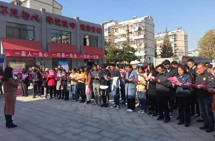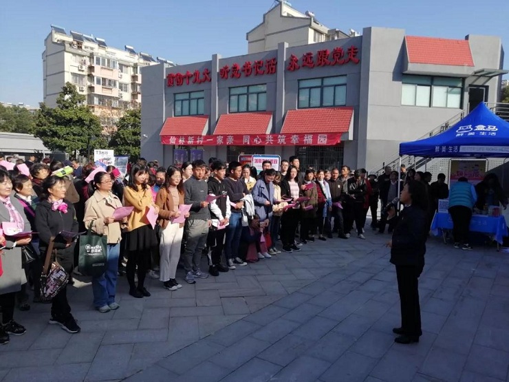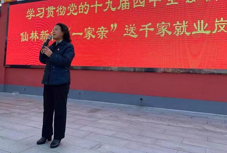 招聘会过程中,仙林大学城管委会副主任、仙林街道党工委书记孙金娣对现场人员进行了集体讲话,感谢用人单位走进仙林新村为当地居民送上就业岗位,动员求职人员转变观念、珍惜机会,找到合适岗位,号召大家学习贯彻党的十九届四中全会精神,构建人人有责、人人尽责、人人享有的社区治理共同体。仙林新村社区党委书记喻辅蓉带领大家诵读了党的十九届四中全会通过的《中共中央关于坚持和完善中国特色社会主义制度、推进国家治理体系和治理能力现代化若干重大问题的决定》中部分节选段落和《致仙林新村家家户户的一封信》。