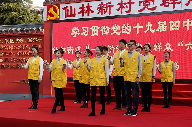 “四中全会开得好,国家治理很重要。平安中国来打造,要确保!美丽仙林是我家,网格连着你我他。文明创建要靠谁,千万家!”锣鼓三句半表演《同心共筑幸福园》,仙林新村的居民们用高昂的热情,嘹亮的声音,表达了对党的十九届四中全会的赞颂,对党忠诚、对美好生活的向往。配音朗诵《学习宣传贯彻党的十九届四中全会精神掀高潮》、情景剧表演《今夜星光灿烂》、配音群口快板《我们都是仙林人》、舞蹈表演《祝福祖国》、乐器合奏《映山红》《我和我的祖国》、革命歌曲联唱《东方红》、《社会主义好》、《没有共产党就没有新中国》等喜闻乐见的节目形式深受观众欢迎,赢得阵阵掌声。