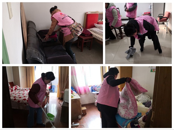 在辖区独居老人家中,志愿者主动和老人聊天,了解老人的生活状况。随后,志愿者们拿起扫帚和抹布,扫地的扫地,擦桌的擦桌,经过志愿者们的辛勤劳作,老人家居环境变的比原来变得更整洁、卫生。