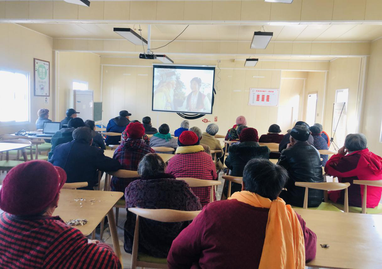 “树上的鸟儿成双对,绿水青山带笑颜......”伴随着那悠扬的旋律和优美的歌声,部分老人也眯着眼跟着哼唱了起来。在观看中,随着剧情的发展,老人们一边开怀大笑一边互相讨论剧情。一会儿又被董永和七仙女的爱情感动的泪眼婆娑。张奶奶告诉我们,看这《天仙配》让她想起了小时候看露天电影的情形。