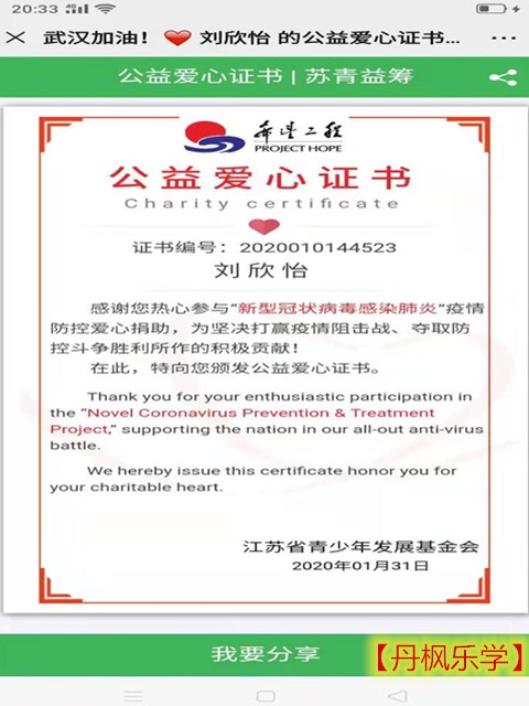 2020年1月31日晚上,社区居民单亲妈妈蔚师傅发给社区工作者一张图片,原来是自己上一年级女儿的捐赠信息。蔚师傅说:疫情发生后,自己女儿就很关注新闻。当看到网上可以捐赠时,就跟我说要把自己今年的压岁钱和平时攒的零花钱全部捐出去,国家有难,她作为少先队员要奉献自己的一点力量。希望武汉疫情早点好起来!武汉加油!