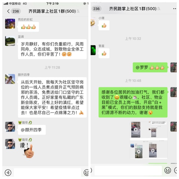 “从后天开始,我每天为社区坚守岗位的一线人员煮点提升正气预防病邪的茶汤,免费送给门口坚守的工作人员喝。正好家里有私藏的广东新会陈皮,还有上好的滇红,希望能保大家平安!希望疫情早点过去!也是尽自己一点绵薄之力!”社区居民“颜开四季”在 “齐民路掌上社区群”里说“特殊关头,大家要团结互助,我也就是做点自己能做的小事”。 “这样的宣传要加大,居民会感觉有安全感的,辛苦了!”居民“沉默的芭蕉”说。此次社区、物业、居民携手共同筑牢疫情防控网,不仅保障了社区安全,也提高了居民们对疫情的关注和自我防护意识,掀起了全民“抗疫”的热情, “谢谢你们,有你们真好!”不断有居民在微信群里向社区党总支表示感谢。