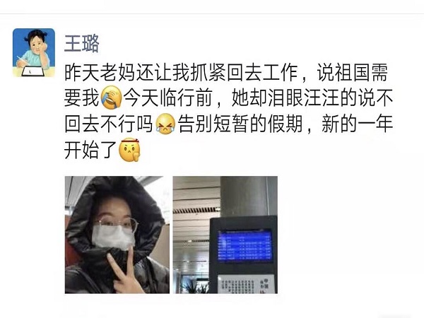 大年初四,社区群里通知工作人员初五进行上班,加紧疫情防控工作的开展。“昨天老妈还让我抓紧回去工作,说祖国需要我。今天临行前,她眼泪汪汪的说不回去不行吗?告别短暂的假期,新的一年开始。”社区副书记王璐的一条朋友圈让大家感动不已。28日晚,王璐购买机票连夜从山东老家赶回了南京,加入社区防控工作。
