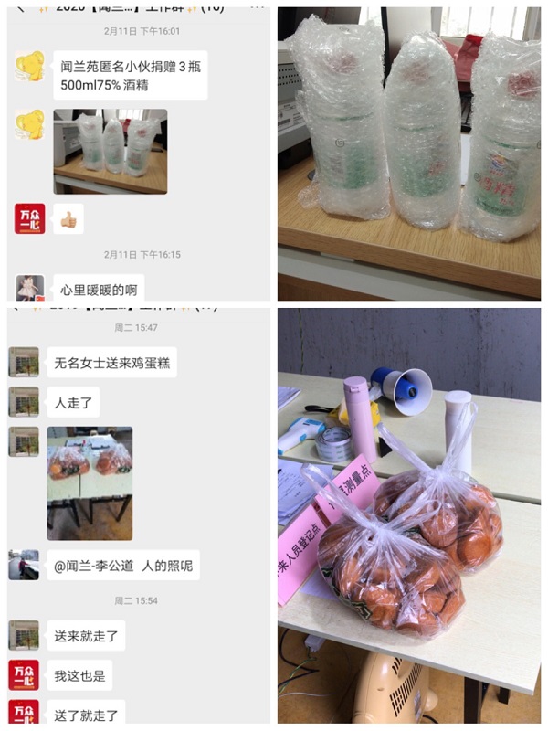 2月的南京晴雨不定、寒风习习,24小时包保制的门岗值班总会让人饥肠辘辘。没有口罩物资,那就送点吃的吧!于是热心的大姐送来热腾腾的泸溪河鸡蛋糕,在两个门岗放下转身就走了,戴着帽子裹着围巾,丝毫看不出来是哪位居民。3瓶酒精,不算多,小区这么大,分分钟就能用完。但这个时候还能“从牙缝里挤出来”送给社区,东西不在多少,心意最为可贵。