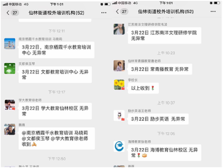 为确保管控工作全覆盖、无遗漏,仙林街道社区教育中心对是否开展线下集中培训活动进行全面排查。同时,充分发挥“群”功能作用,指导机构进一步落实疫情防控要求,及时报送《校外培训机构人员信息排查表》,认真落实“日报告、零报告”制度,校外培训机构每日向社区教育中心报告疫情防控工作情况,确保疫情信息清晰准确透明。