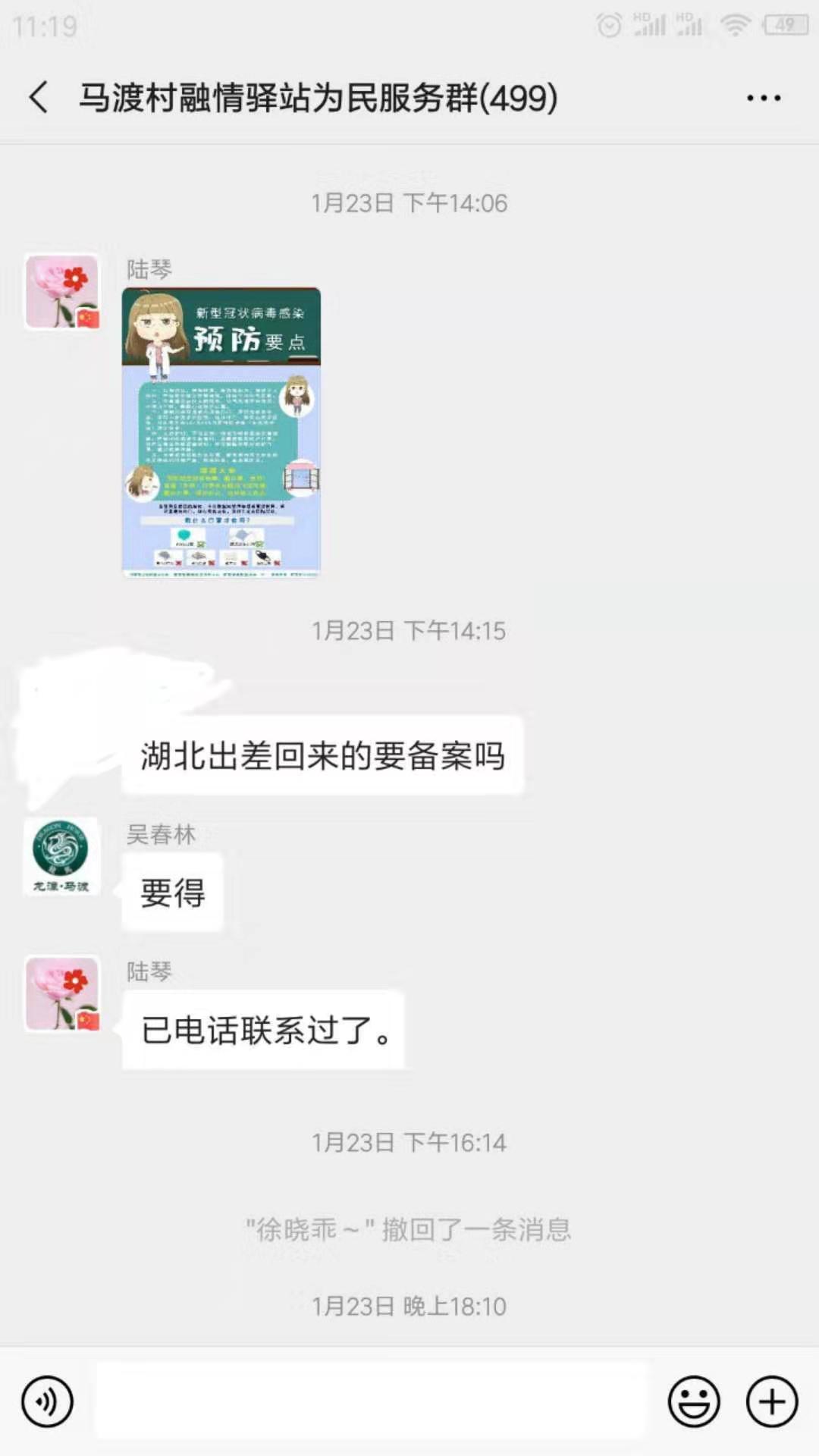 1月23日,村便民服务中心看到一村民在掌上云社区咨询问道:“湖北出差回来的要备案吗?”群主陆琴立马打电话给这个村民了解情况,该村民留下了自己的所有信息,主动向村委会进行报备,并将自行在家进行隔离和体温检测情况告诉了陆琴。村委会根据他的情况将其列为医学观察对象,及时的送去口罩、体温计等物资,宣传防护知识,告知不要外出、居家观察,目前该同志一切正常,无发热、感冒、腹泻等现象。