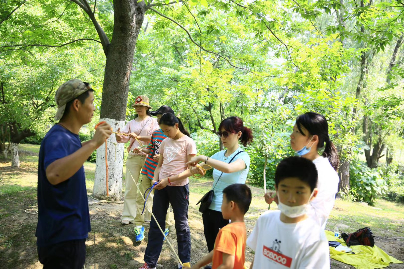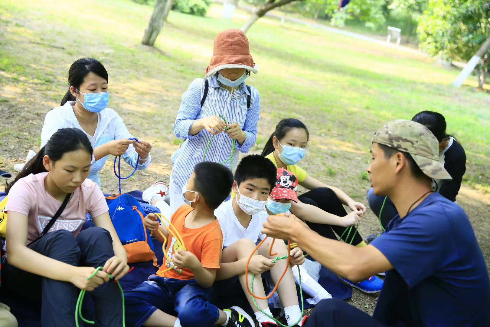 在掌握基本的户外生存知识后,大家分成两个小组跟着老师学习打绳结,在老师手中简单的绳结,孩子和家长们费了“九牛二虎之力”,但是大家都不泄气,互相探索、互相鼓励,直至成功,看着一个个“歪七扭八”的绳结,孩子和家长们脸上露出了欣喜的笑容。