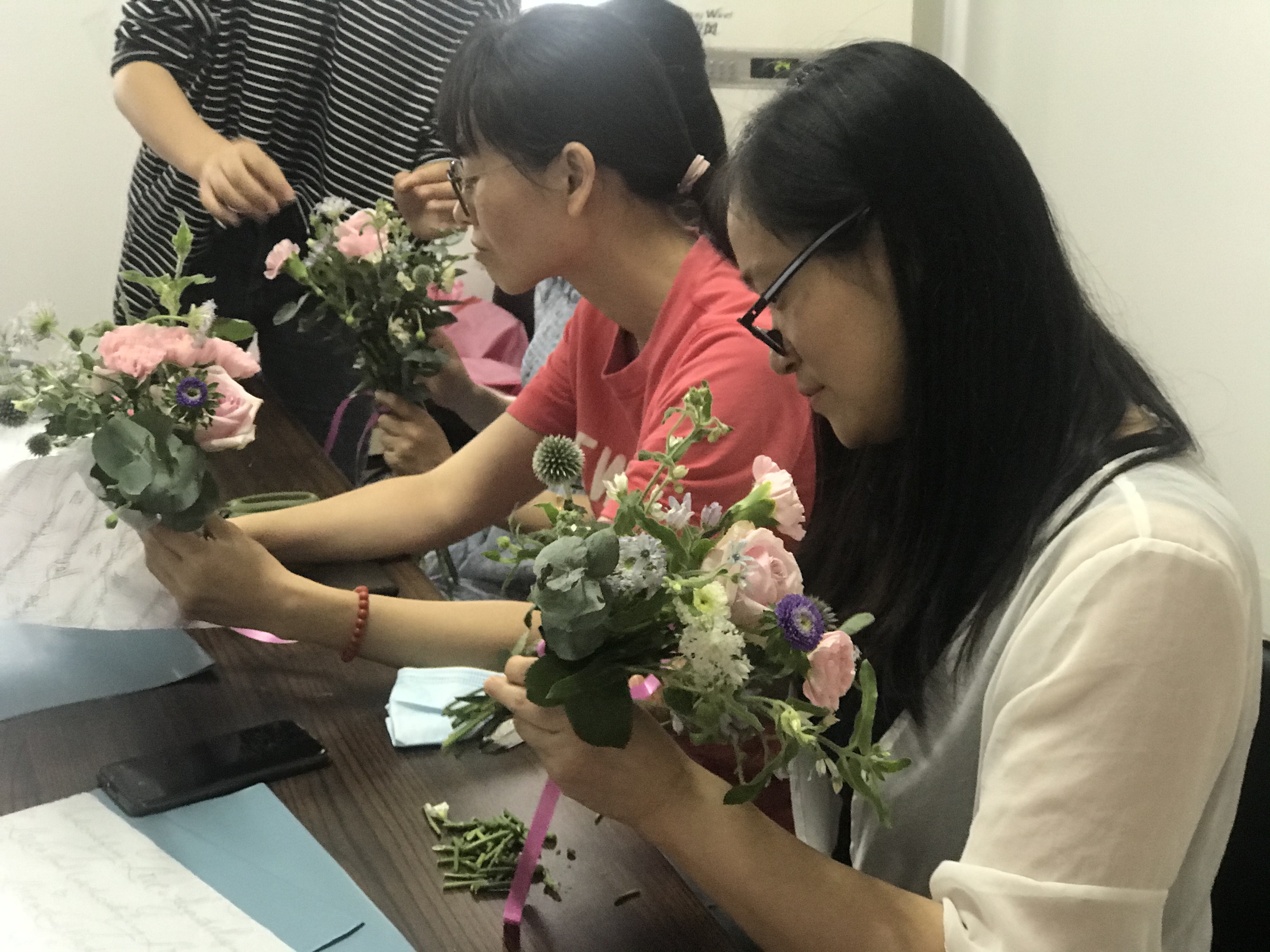活动中,社区居民学校邀请专业的花道师为大家讲解了插花的历史、插花的基础知识和插花的技巧,并通过实际操作的形式让大家学习了花枝修剪、排布及制作手捧花的基本技艺。参与活动的年轻党员们各个兴致勃勃,选花、剪枝、插花......大家边听、边学、边动手操作,并随时与老师互动、探讨。经过老师悉心指导和帮助,一朵花、一枝叶在她们的巧手下高雅大气、清新怡人,经过一个小时的制作,一个个美丽的花束呈现在眼前,变成独具匠心的作品。