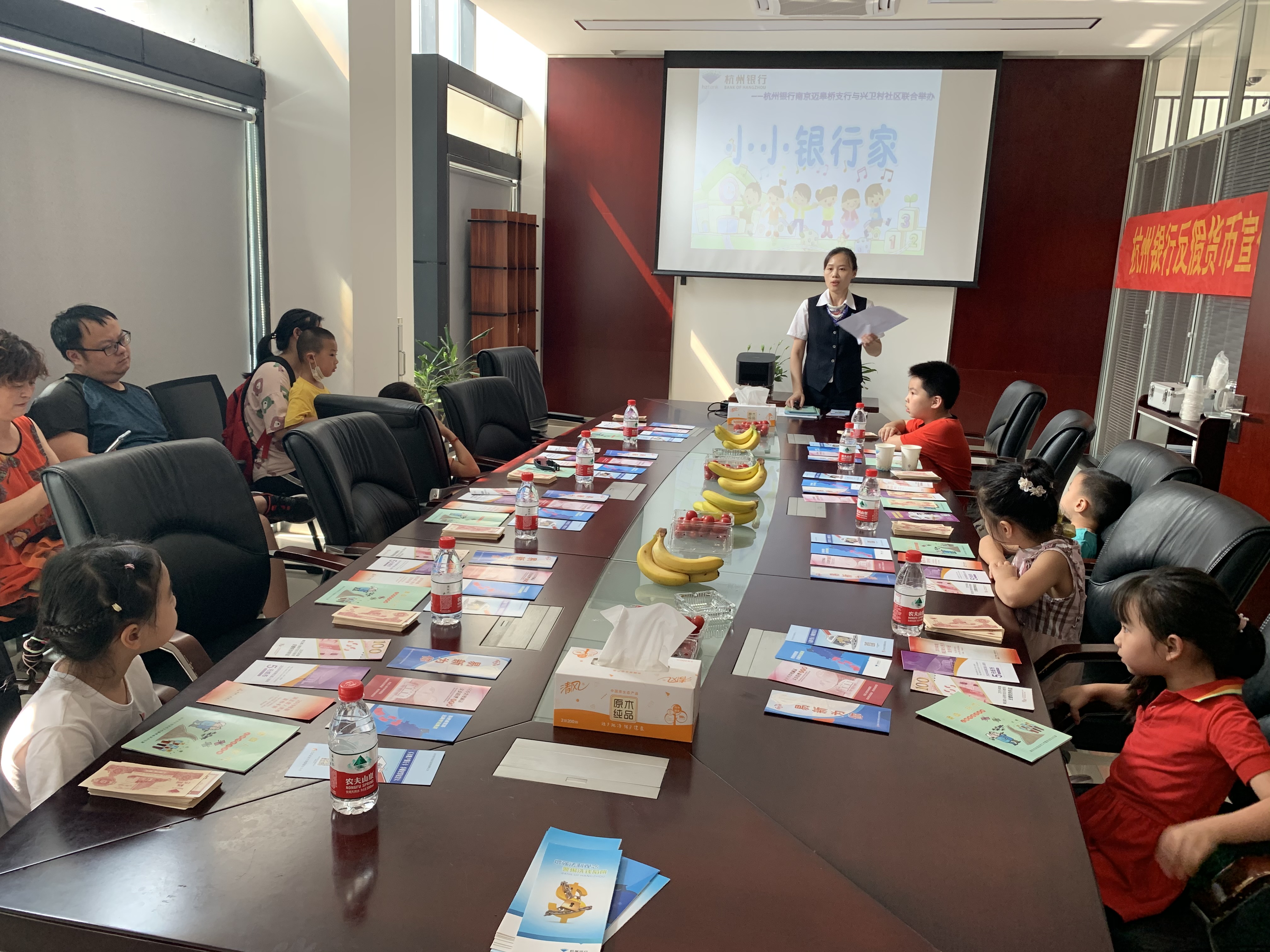 8月19日下午两点半,所有的小朋友及家长抵达杭州银行迈皋桥支行。杭州银行迈皋桥支行在会议室准备了饮料和水果为前来参加活动的小朋友及家长降温解暑。本次活动共有六个活动流程:1.了解银行礼仪;2.学习点钞技巧3.学习新版人民币防伪点;4.认识银行各类机具;5.由小朋友为家长机具上体验开卡流程(陪同家长需携带身份证、手机);6.颁发证书及纪念品。活动现场,小朋友与银行解说员互动频繁,小朋友学会了点钞、辨别人民币真伪、还学到了银行礼仪,气氛热烈,取得了良好的成效,家长们也在本次的活动中了解了更多的金融知识,学到辨别人民币真伪的知识。