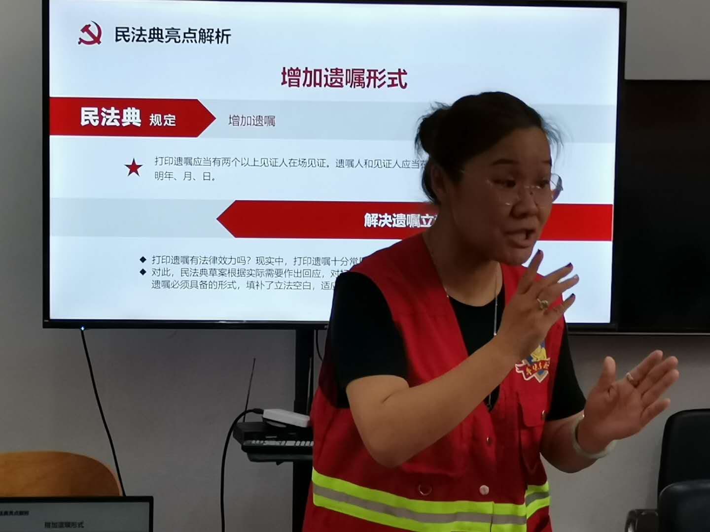 深入普法,保障实施。此次讲座中,电瓷社区邀请高智萍律师在电瓷社区会议室为辖区居民重点解读了遗产范围,并在上次讲座内容的基础上,增加了因隐匿遗嘱、情节严重和以欺诈、胁迫手段迫使或者妨碍被继承人设立、变更或者撤回遗嘱、情节严重等丧失继承权的情形。同时针对在相对丧失继承权、完善代为继承制度等对继承人的宽恕制度中,扩大法定继承人的范围为被继承人增加立遗嘱形式,删除了公证遗嘱效力优先的规则。让辖区居民学好、学透、学深《民法典》的内容知识,达到学以致用,在辖区内营造经常学法、严格守法、自觉用法的良好氛围。