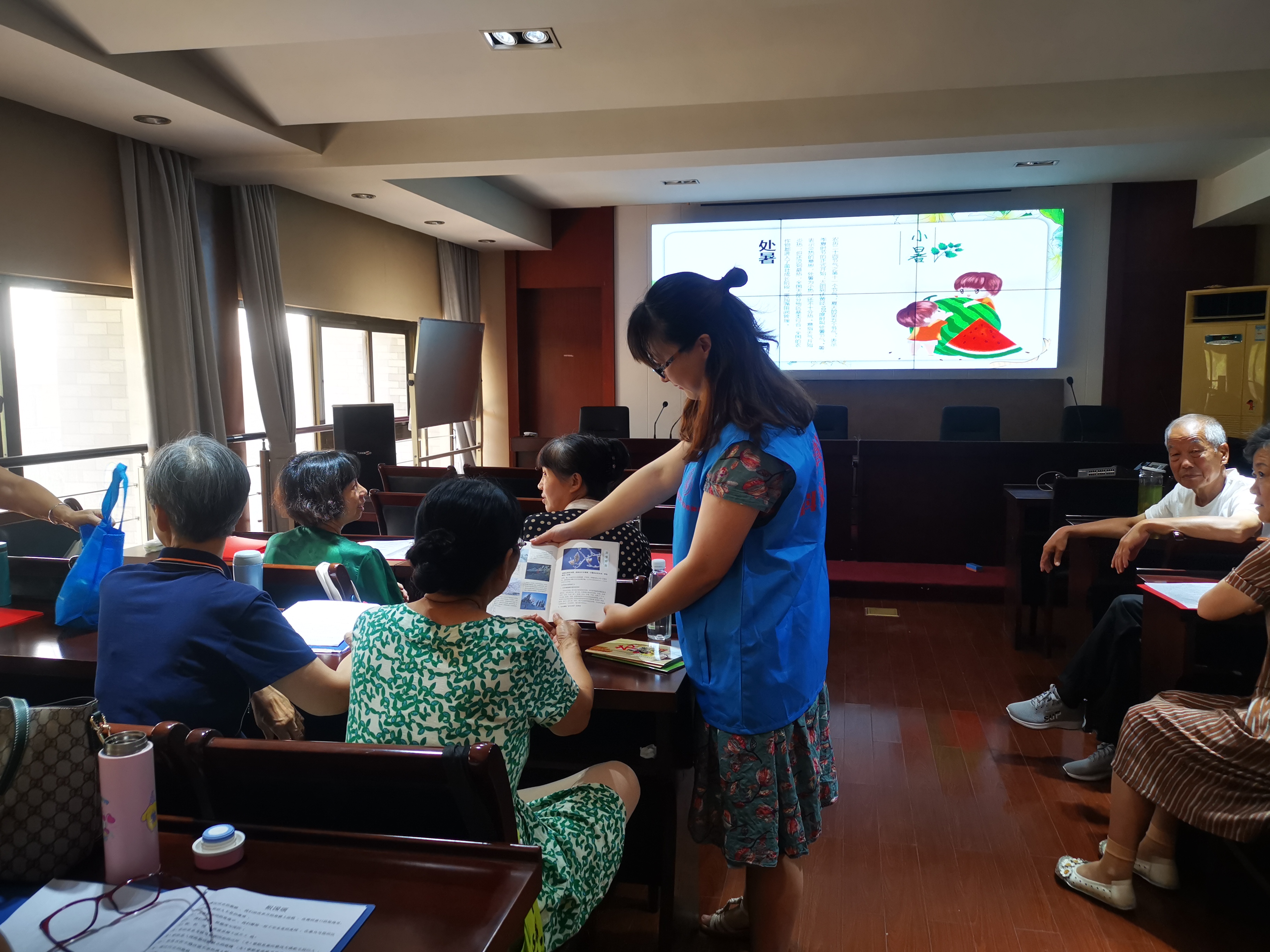 全科社工主要从处暑节气的由来、节气的相关介绍、节气习俗和处暑节气养生知识四个方面进行讲解,处暑是人体阳气最旺盛的时候,“春夏养阳”。处暑虽不是一年中最炎热的季节,但紧接着就是一年中最热的季节大暑,民间有“处暑大暑,上蒸下煮”之说。所以人们在工作劳动之时,要注意劳逸结合,保护人体的阳气。除了讲解处暑节气的知识,志愿者还向居民发放了节气养生手册,有效增强了居民们的健康养生意识。