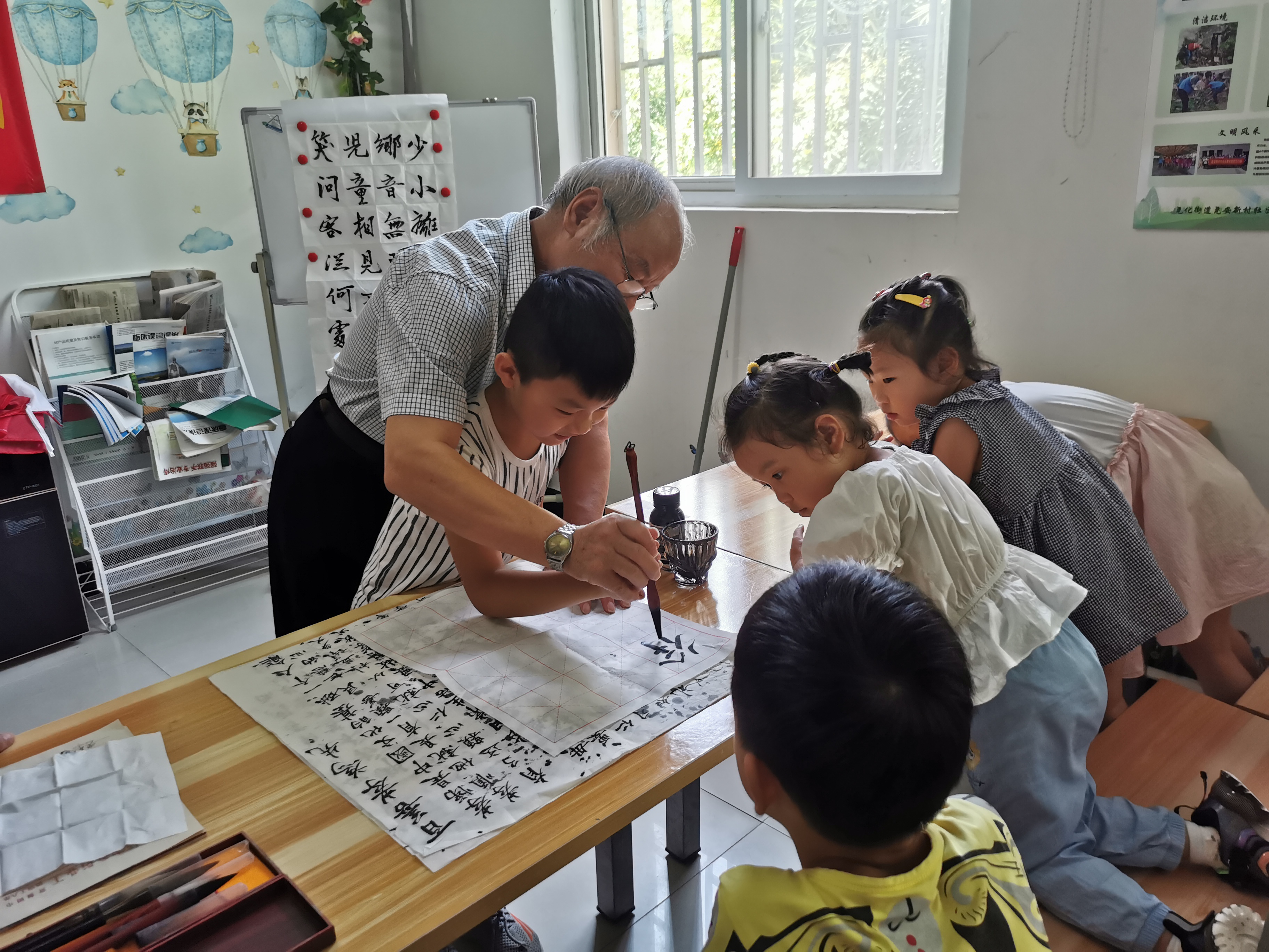 在踊跃的发言声中,气氛逐渐热闹,孩子们对志愿者不再感到陌生,于是当“能人手工坊”的时间银行志愿者钟老师一出现,便受到了热烈的欢迎。钟老师带着和蔼的笑容拿出笔、墨、纸、砚等活动工具,随后又展示了一张“百善孝为先”的书法作品激发孩子们的兴趣,科普书法知识。学习中,钟老先生选取了几首耳熟能详的古诗词,让孩子们围坐在桌边,现场指导书法技巧。最后,经过“能人”钟老先生和孩子们共同的努力,一首《回乡偶书》书法作品引得现场的家长们连连称赞。