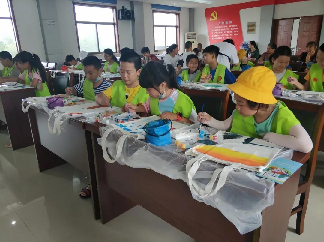 在手工画制作环节,孩子们跟着手工画老师在帆布袋上创作倡导文明行为内容的宣传画,有垃圾分类、绿水青山、蓝天白云等,孩子们用自己的创意展示对绿色家园美好生活的向往。