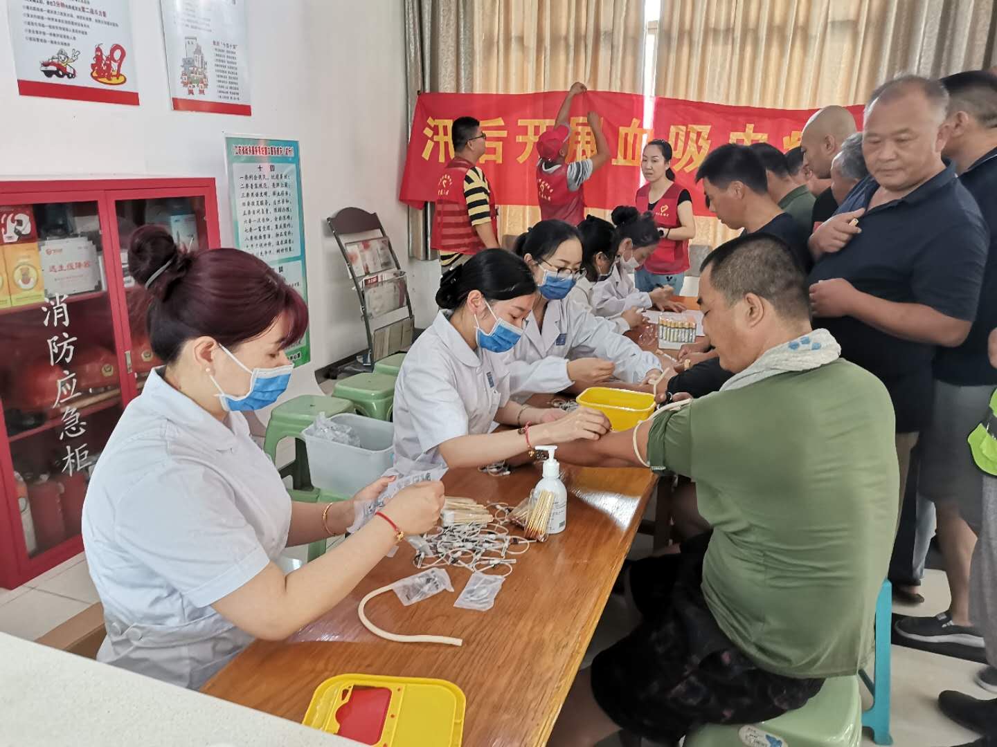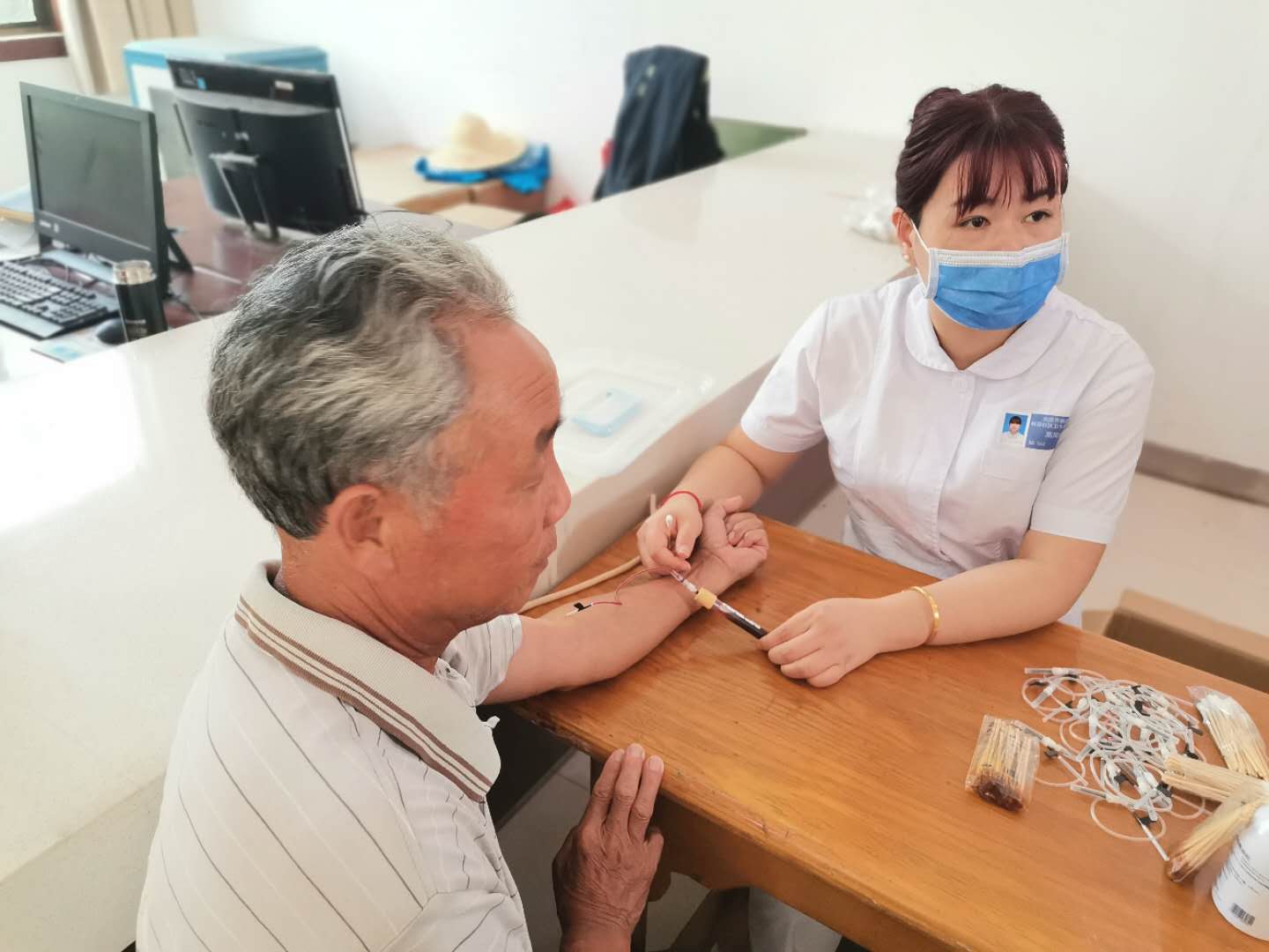 “请排好队,我们喊到名字的到这里来拿抽血管,再进行抽血,最后到柜台那服药”卫生院的一名护士说道。“谢谢、谢谢,还特地为我们排查血吸虫病,吃过药就可以了吧。”一顺物流的一名工人对卫生院的于院长问道。“今天不能喝酒啊,如果有什么不舒服的立即告诉社区高主任,他会和我们联系。”于院长回答说。大家对社区工作人员和医护人员细致耐心的服务感到非常满意。