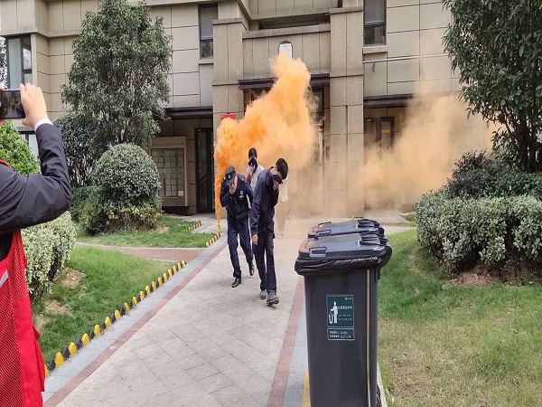 在现场消防联合演练过程中,仙林湖党总支与春天物业模拟火灾现场在楼道内释放烟雾弹,播放警铃。居民听到消防警铃、看到浓烟现象,在物业工作人员的带领组织下,做到不慌乱,有序地从楼道内疏散逃离危险地带;受浓烟影响居民人有意识地拿湿毛巾捂住口鼻依次疏散逃生。随后物业人员展开灭火行动,维护火灾现场外围秩序。