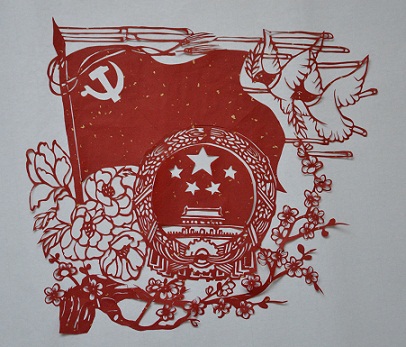 刘干将的作品用高高飘扬的党旗、熠熠生辉的国徽、傲霜斗雪的梅花、飞翔的白鸽和花开富贵的牡丹精巧构图,传递着中国坚定制度自信,在中国共产党的领导下,国家更加欣欣向荣的景象。