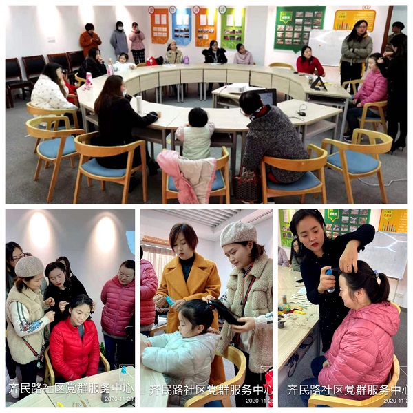 2020年11月29日上午,“齐学堂”开了一节“美发”教学课,招募了20余名学员参加。活动中,教学老师从参与者当中选出了几位居民作为本次活动的现场模特,并根据每个人的不同气质与要求设计出适合自己的发型。不一会儿,“编发达人”冯老师手下生花,快速演示了韩式麻花辫、花苞头、发帘辫子等常见编发发型。冯老师让大家两两组队,从头开始一步一步的教导大家。
