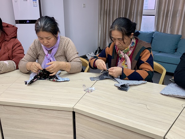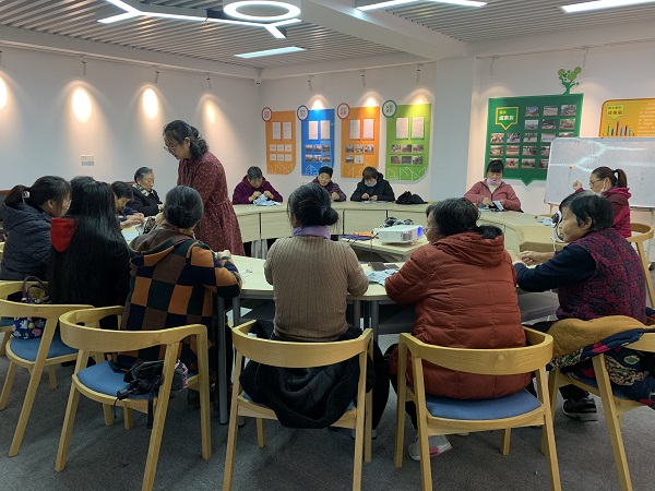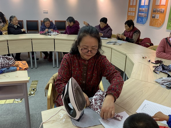下午2点半,手工课堂正式开始,牛老师先给大家介绍了本次手工活动使用的材料,面布、里布和缝制手法。老师亲自示范,个别辅导,让大家掌握包边缝合要领。在老师的指导下,有的人很快掌握了要领,先学会的居民在完成自己的作品之余,还热心地手把手帮助了周围的人掌握技巧,现场气氛活跃,居民之间互相沟通、互相学习,一起交流编织的技巧。两个多小时的手工缝制活动,大家都完成了自己的手工布袋,看着自己缝制的成品,欣喜之情油然而生。参加活动的居民纷纷表示:现在娱乐生活少,在家里退休了没事, 希望这样的活动,社区多多举办,能学到东西还有趣。