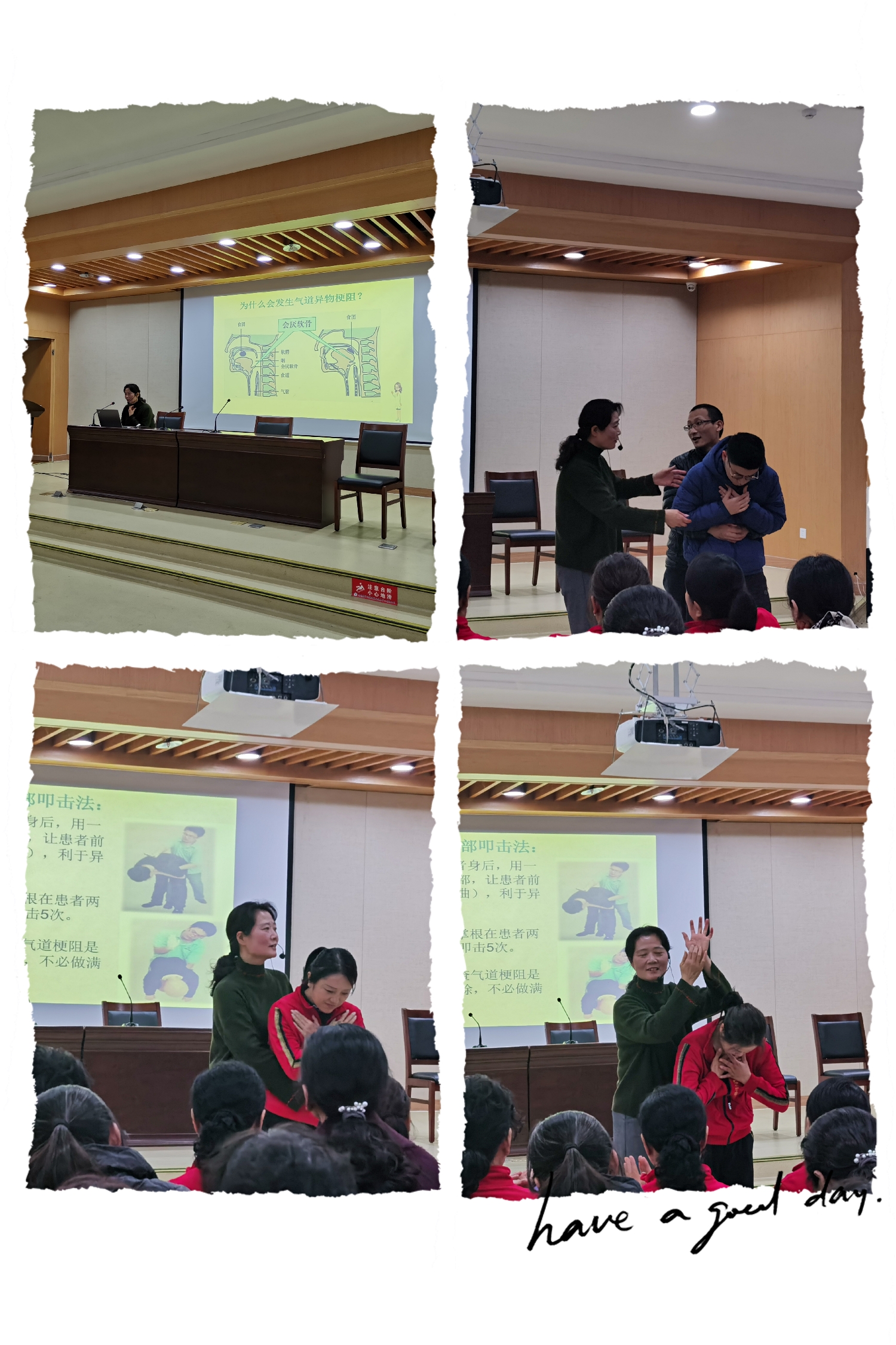 来自燕子矶中心小学的周洁老师给大家带来如何海姆立克急救的讲座。讲座即有理论讲解,又有现场演示,实用性强。