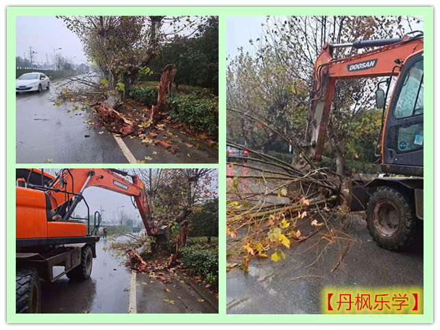 为保障道路车辆的安全通行和群众出行安全,社区居民学校接到报告后,组织社区志愿者们第一时间赶到了事故现场,并在周边放置了安全锥进行隔离,同时,一一提醒过往车辆注意安全,防止发生次生事故。随后叫来挖机对倒伏树木进行清移,再由工作人员及时清扫道路上的残余树枝、树叶。经过半个小时的清理,路面恢复了畅通,及时消除了安全隐患。