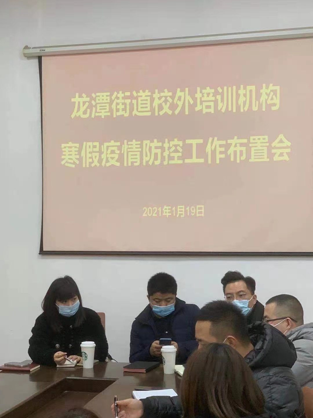 根据省教育厅《关于做好很假前后学校疫情防控工作的通知》精神和栖霞区校外培训机构专场整治工作领导小组《关于开展2021年全区中小学寒假期间校外培训机构防疫工作巡查工作方案》要求,龙潭街道卫教办与社区教育中心于元月19日上午召开了龙潭街道校外培训机构寒假疫情防控布置会。卫教办陈少伟主任、社区教育中心王明鹏校长及教师、街道所属16家校外培训机构负责人参加会议。