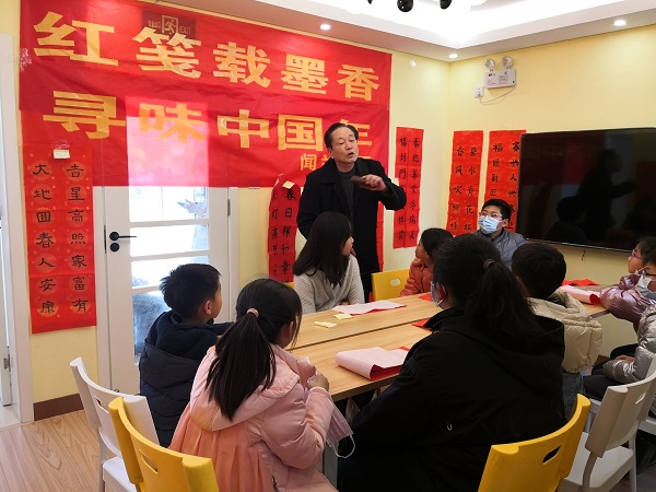 “同学们,春联为什么是红色的?”“因为红色表示喜庆”,小朋友们齐声答道。“那么大家写的这些春联都是什么字体呢?”“楷书,还有一个同学写的是隶书。”“这个同学写的不错,但是有一个小毛病,很遗憾,老师不能给一等奖了”,周老师指着其中一副对联,指出了存在的问题,鼓励同学继续努力。在老师和学生的一问一答中,周老师将春联和书法的知识传达给了在座的同学们。