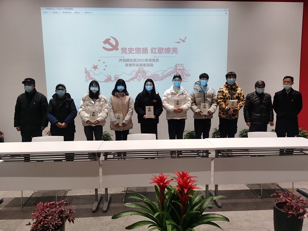 本次活动,社区党总支将冬训课堂搬到了美丽乡村桦墅村,来到了凤凰农家书屋。青年志愿者都是晶都茗苑小区的大学生,在去年的防疫工作中,他们积极加入了防疫志愿队伍,为社区分担工作上的压力。今年开学,他们也向学校主动递交了入党申请书,用实际行动努力向党组织靠拢,其中江苏理工学院的葛蓉同学已经是预备党员。在凤凰书屋,党员和青年志愿者们共上了一节党课,老党员葛义顺、袁仁福分别领读了《习近平新时代中国特色社会主义思想学习纲要》和《习近平关于[不忘初心、牢记使命]论述摘编》。为了敦促青年们努力学习,党员们还为青年志愿者们赠送了书籍《习近平谈治国理政》(第三卷),青年志愿者代表葛蓉和大家分享了自己的“入党故事”,并带领大家共同学习了南京党史大事记(1921年)。最后大家齐声合唱了红歌《没有共产党就没有新中国》,来感恩中国共产党代领人民走过的风雨百年。