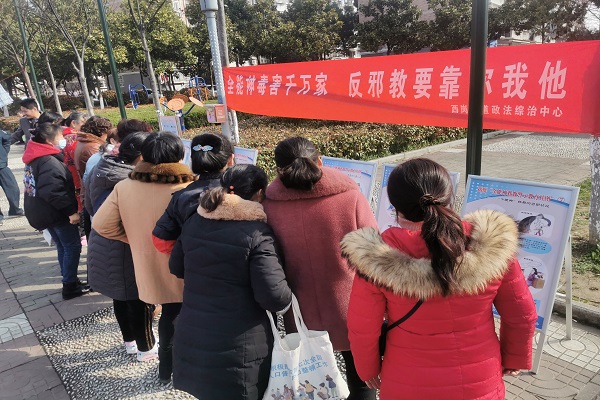 在广场的另一边,街道综治办反邪教组织通过悬挂横幅、摆放宣传展板向居民宣传反邪教知识,以图文结合的形式生动形象的介绍邪教全能神的基本特征、传播方式、思想状况等,向居民揭露全能神的本质,共同参与反邪教,护好千万家。