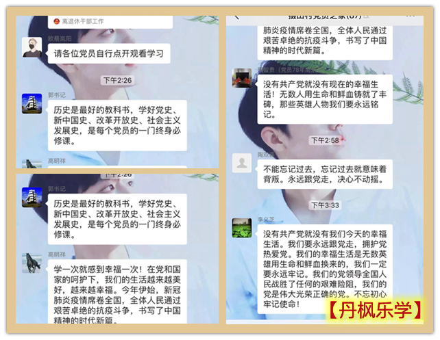 创新方式方法,组织全体老党员通过“党员之家”微信群,以线上学习形式集中收看了中央党史和文献研究院学术和编审委员会主任陈理同志所作《从中国共产党百年历史中汲取继续前进的智慧和力量》党史学习教育专题报告,深入学习贯彻习近平总书记有关重要讲话精神和党史学习教育内容。在线上学习活动中,每名老党员都力争做到学史明理、学史增信、学史崇德、学史力行,学有所思、学有所悟、学有所得。学习党史讲座在老同志中反响热烈:党小组长高明祥表示,学一次就感到幸福一次!在党和国家的呵护下,我们的生活越来越美好,越来越幸福。今年伊始,新冠肺炎疫情席卷全国,全体人民通过艰苦卓绝的抗疫斗争,书写了中国精神的时代新篇。