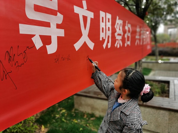 为进一步营造良好的卫生环境,倡导广大居民文明祭祀,4月2日,齐民路社区新时代文明实践站联合高校志愿者在晶都茗苑小区开展了“倡导文明祭扫 共护美好环境”主题志愿活动。活动现场邀请居民在宣传横幅上签名承诺,有居民表示:随着时代的变迁,自己越来越能接受鲜花祭扫的方式。文明新风的吹入,让更多的人自觉摒弃烧纸钱、燃放鞭炮等祭祀陋习,鲜花祭扫、公祭悼念、网上祭祀、家庭追思会等文明方式在潜移默化中走入百姓家。