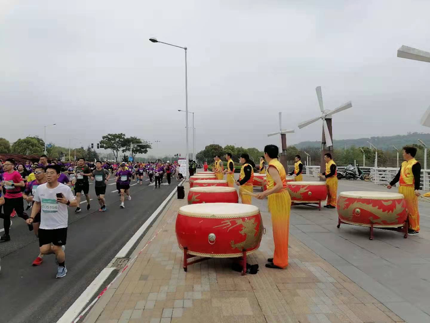 清晨的仙林比赛赛道已是人潮涌动。6时许,虽然离正式比赛还有1个多小时,龙鼓队队员们就早早来到离起点2公里处的仙林大道九乡河生态园赛道一侧,抬架、摆鼓、调音,有条不紊地的进行准备工作。8点,仙马正式开跑,穿红着绿的比赛选手们从羊山湖公园西门起点鱼贯而出,经过2公里,络绎不绝地涌入到仙林大道九乡河生态园一侧,霎时间,人声鼎沸,龙鼓表演队的队员们各个身着盛装、精神抖擞一个个逐渐进入状态,每一个鼓点都充满了力量与激情,随着选手们不断经过,表演队员们时而急促、时而缓慢地变换着演出节奏,用大鼓独特的节奏为所有参赛选手助威。就着咚咚的鼓点,路过的市民选手纷纷与退役军人龙鼓队合影留恋。