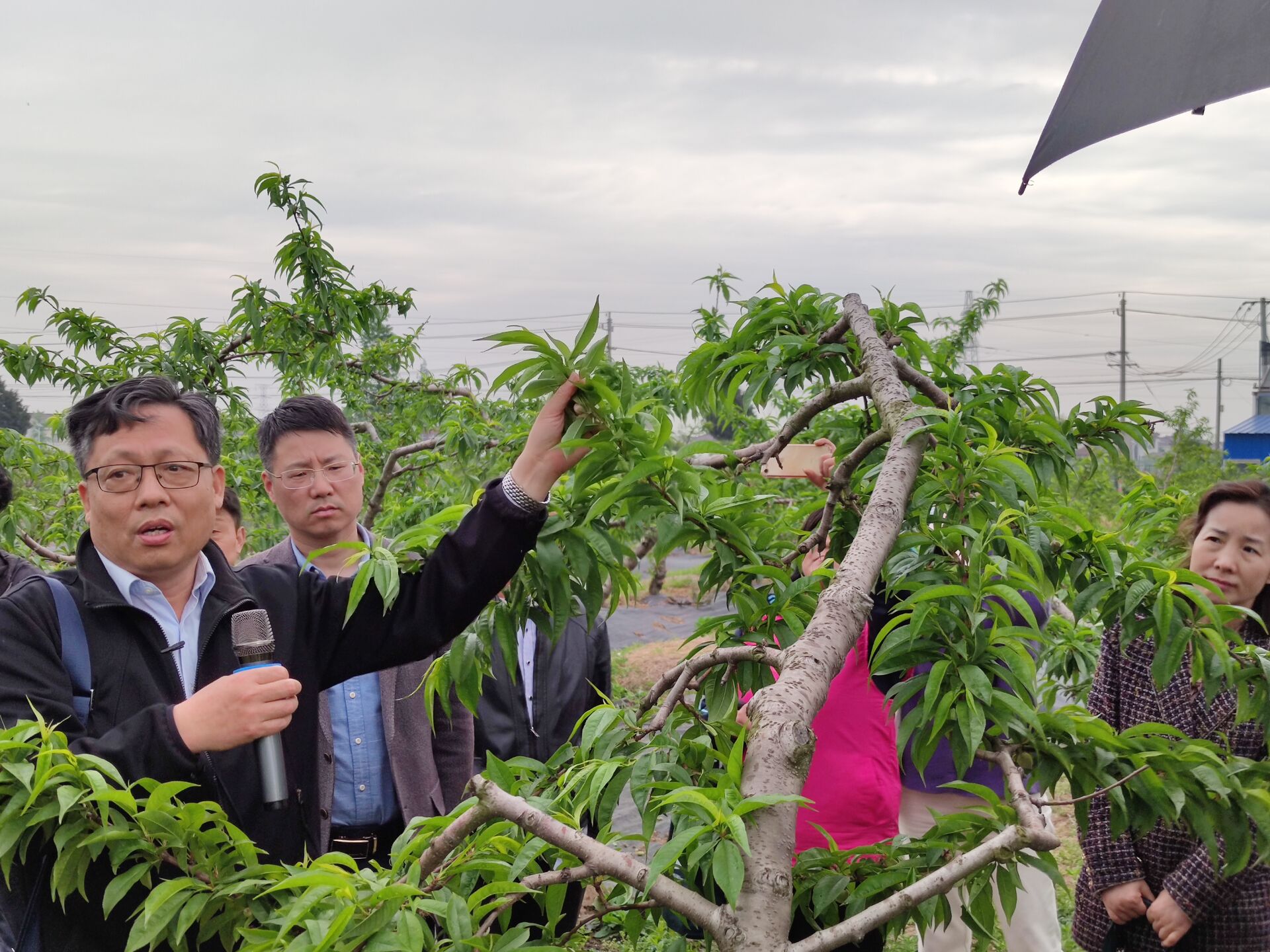 活动第二部分,与会一行人来到田间,渠教授现场为大家讲解了果树留果,杂草管理,种植密度控制等问题,虽然天空下着蒙蒙细雨但是大家汲取知识的热情十分高涨。