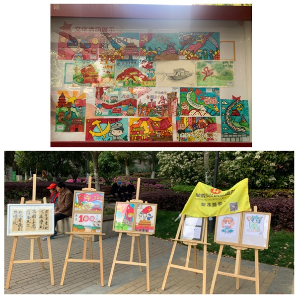 最后,我们将孩子们的作品展示在小区的长廊宣传栏以及小区的广场上。一幅幅色彩艳丽饱满、充满童真童趣的画作,映入我们的眼帘,给小区增添了许多的人文色彩,营造了浓浓的红色爱国氛围,吸引了众多居民前来观赏和称赞。此外,齐民路社区的LOGO、“齐心向党,智联筑梦”的标语、以及刻有“富强、民主、文明、和谐......”的党建长廊,都清晰地展现在作品中。这些元素不仅仅代表着齐民路社区,更体现了社区不断紧跟共产党步伐的坚定信念。