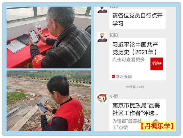 自党史学习教育开展以来,摄山村党委采用“线上+线下”互动学习方式,扎实开展离退休老党员的党史学习教育,确保党史学习教育全覆盖。充分利用好离退休人员的微信学习群,以“学习强国”、“红枫视窗”微信公众号为载体,通过指尖定期推送“微课堂”,让学习党史更加常态化,实现随时随地学。“随手可听,随时可看,时间不长,能记得住。”老党员们纷纷为这种线上学习模式点赞。线下集中组织收看党史专题电教片并相互交流心得,激励老党员思想不退休、退休不褪色。