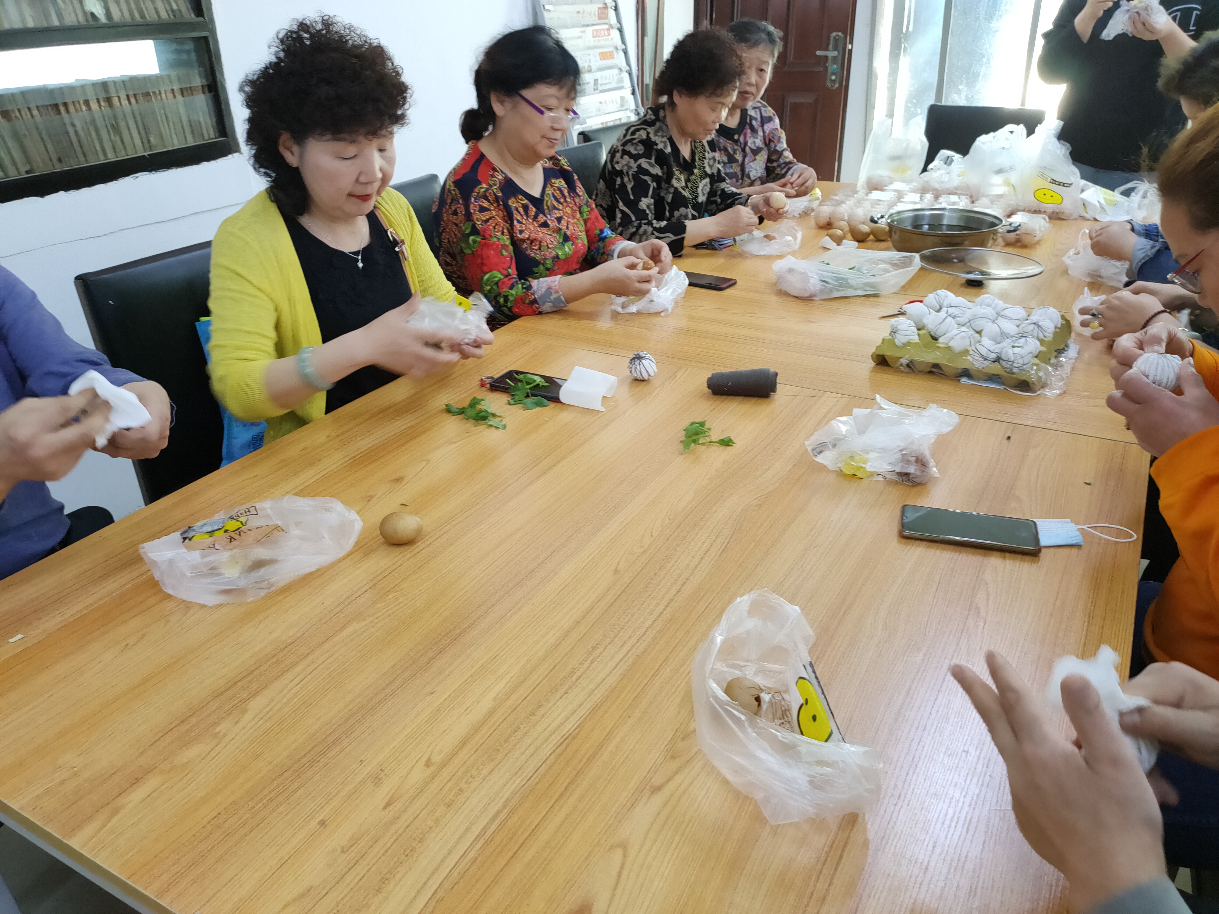讲座后,金老师带领大家一起做养生鸡蛋——“印花鸡蛋”。暖翼社会服务中心准备了草鸡蛋、紫皮圆洋葱、 方形布和线、卤蛋调料、各种蔬菜叶子……居民们分工合作,有的清洗蔬菜,有的清洗鸡蛋,有的准备辅材,有的用纱布包裹鸡蛋,既锻炼了居民的动手能力,也促进了邻里关系的融合,经过2小时的分工合作,美美的印花鸡蛋全部完工,之后大家还一同分享了五香味的印花鸡蛋。