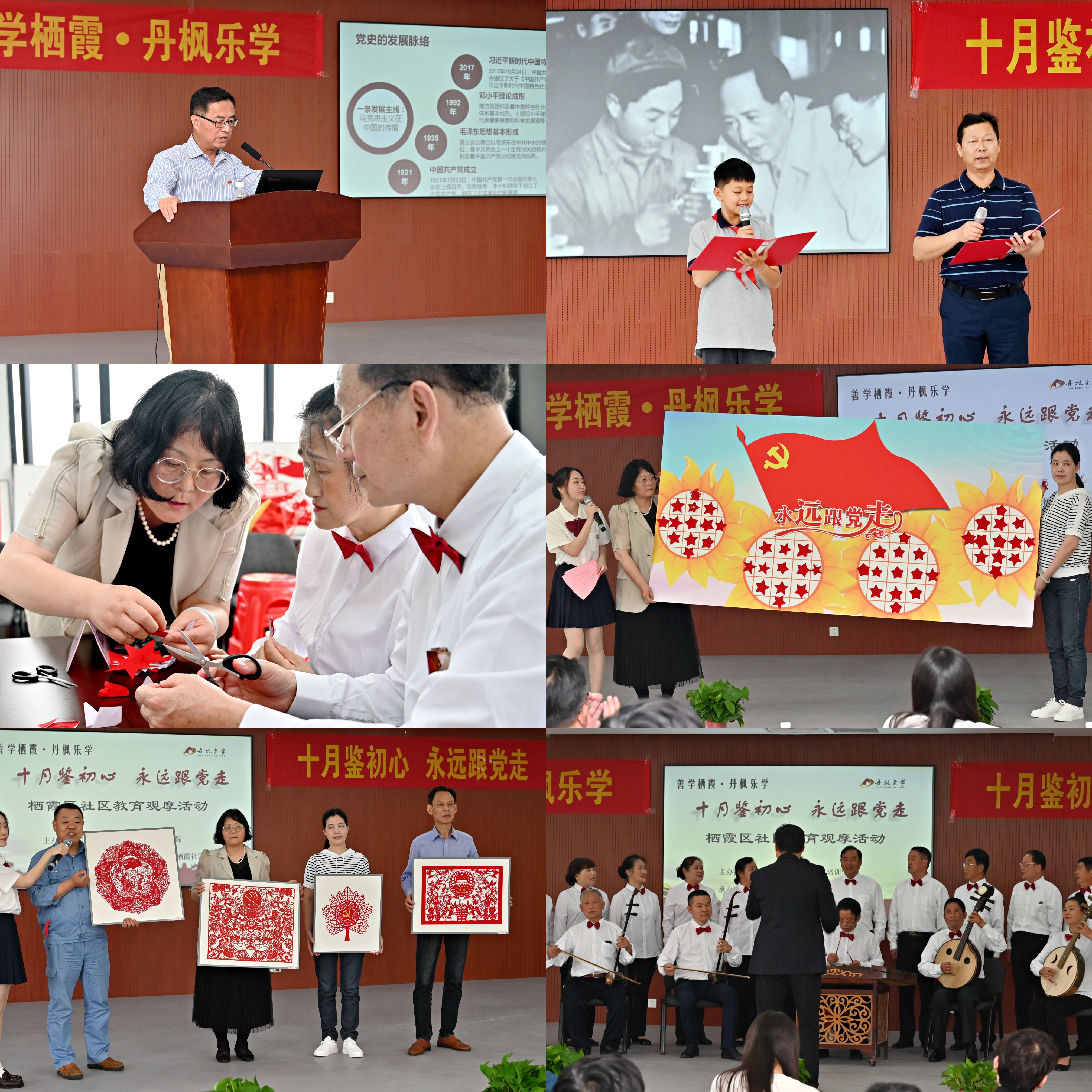 观摩环节由三部分组成,首先,栖霞区《栖霞山》杂志社编辑罗正斌为大家开展了一场“学党史,感党恩”的讲座,短短半小时,在场的居民了解了中国共产党百年奋斗史,深刻认识中国共产党对中华民族的历史贡献,使切身感受到中国共产党的恩情;接着老少同台,以一首社区居民胡国富原创朗诵作品《伟大的号召》,共同歌颂伟大的中国共产党;最后,由丹枫乐学剪纸工艺坊学员上台,为大家展示并解说为庆祝中国共产党成立100周年创作的剪纸作品。剪纸工艺坊葛老师还现场带领大家一起剪“五角星”,激发了居民对手工剪纸的热情和向往。