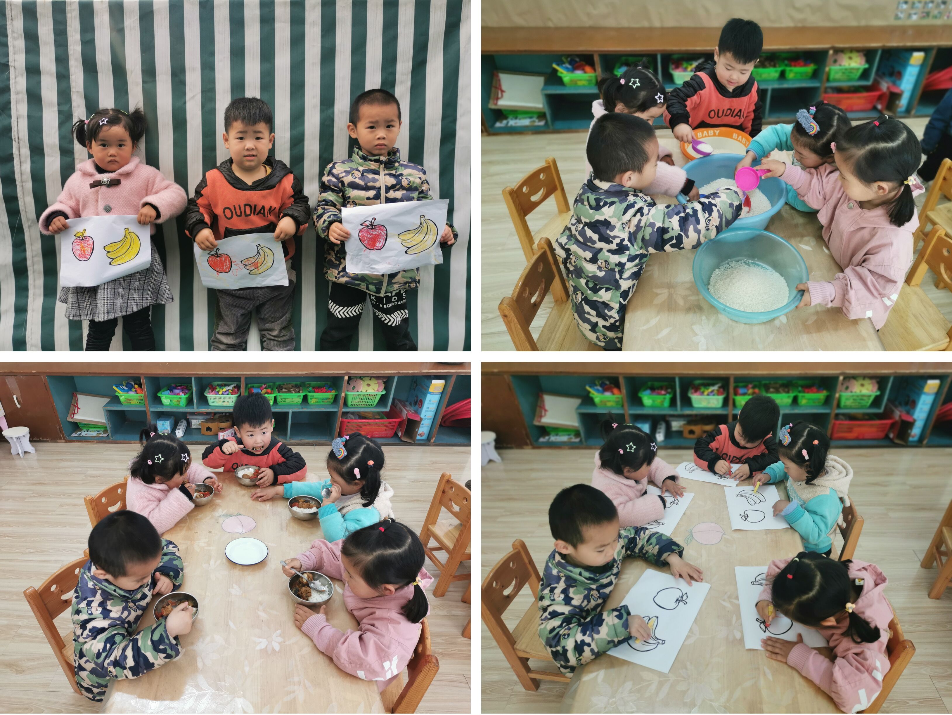 老师准备了两盆大米,让孩子触摸和体验,并讲述大米种植的过程以及告知孩子袁隆平爷爷这一人物在粮食种植领域和作出的贡献。在老师的带领下,孩子们用卡纸做“量杯”试装大米,并在纸上绘出了苹果、香蕉等水果。