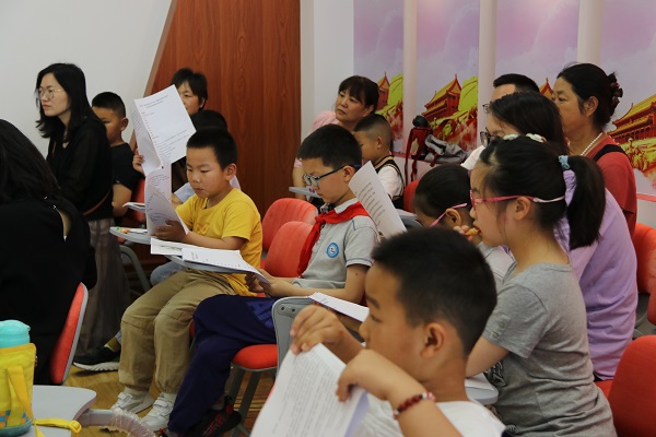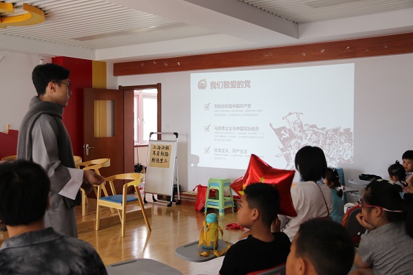 “你们知道伟大的中国共产党是怎么诞生的吗?”演出排练前,就中国共产党的诞生问题,南师大的学生党员给在场的小朋友上起了党课。课堂上,学生党员为小朋友们讲述了中共一大产生的背景、参会的主要人物以及会议的曲折过程。小朋友们听的津津有味,时不时冒出几个问题,“马克思是谁?”,“毛泽东我知道,是毛主席......”当说到有密探闯入的时候,小朋友们都屏住呼吸,跟随着参会人员一起紧张起来......现场时而严肃时而活跃。