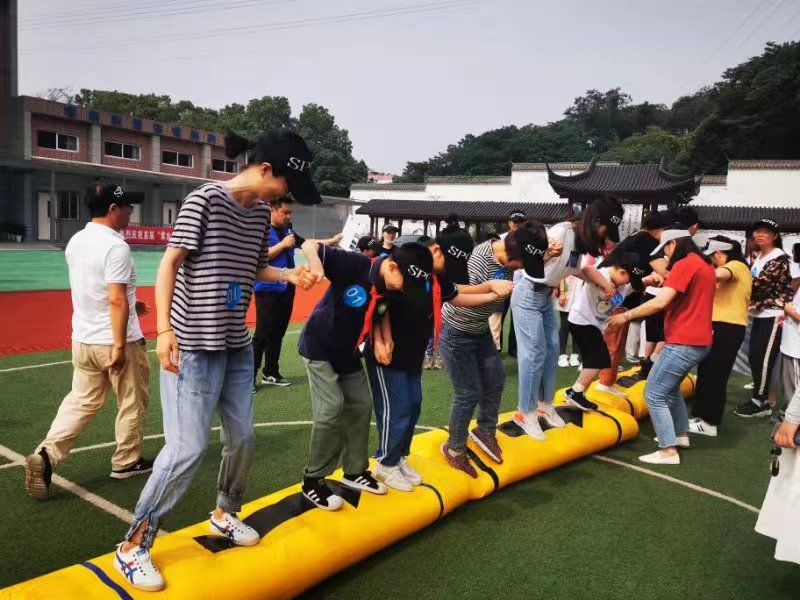 在“同舟共济渡赤水”游戏中,起点6对家庭踩在4个充气竹筏上,所有人脚不能碰地,最后1名家长将第4个充气竹筏往前传递,交给最前方的家长,依次往前进。家中们和孩子们同舟共济