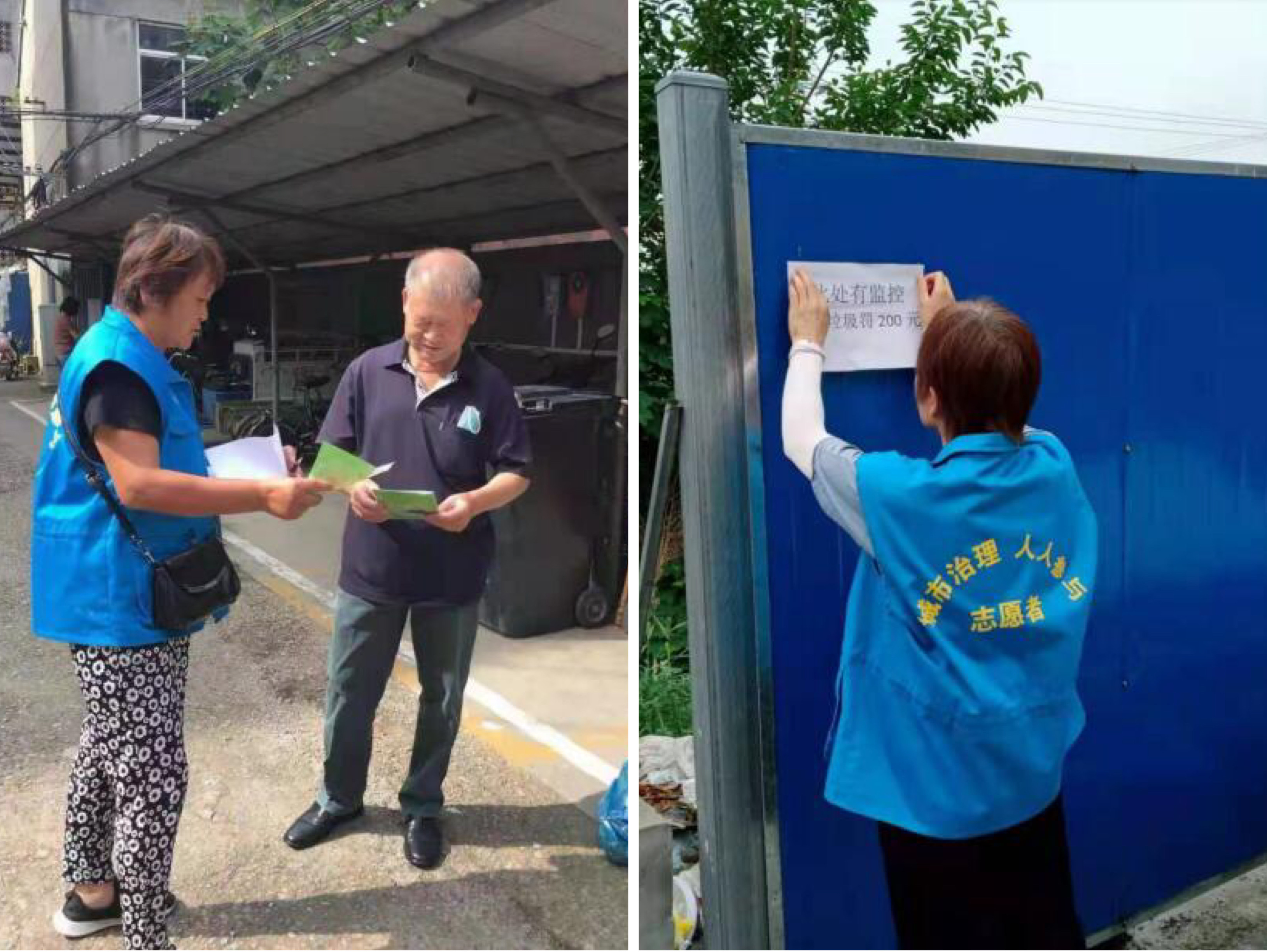 在巡查过程中,社区志愿者们发现少数居民并未按要求投放垃圾,存在垃圾混装、乱放的情况。于是,志愿者们便采用走村入户的方式,向居民们发放垃圾分类宣传册,并讲解垃圾如何分类、分类的影响等知识,强化居民垃圾分类的意识。同时,志愿者还在垃圾收集点以及楼栋墙面的显眼位置张贴乱扔垃圾处罚宣传单,以罚款的形式严厉打击垃圾不分类的现象。