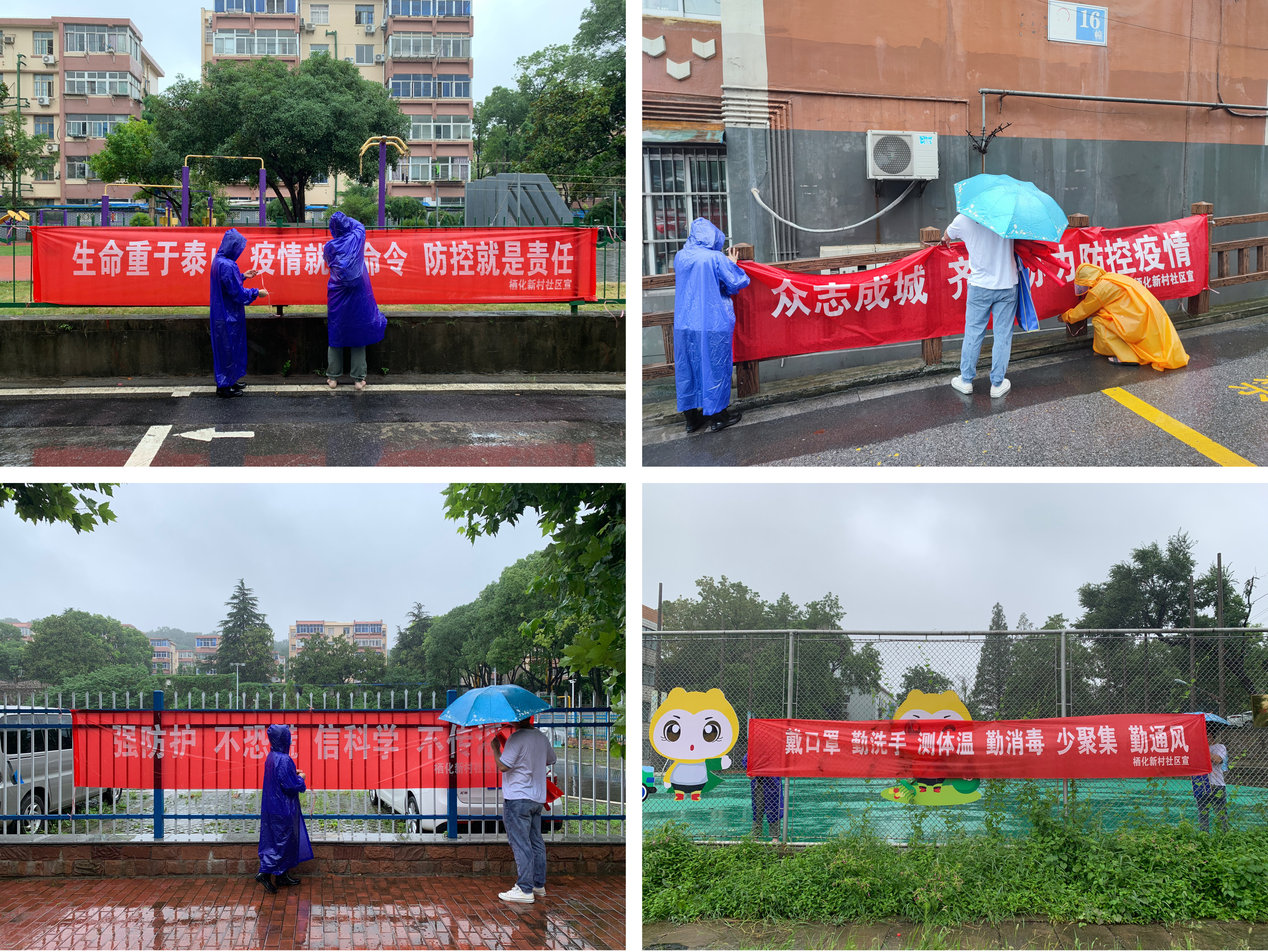虽然近来雨水连连,但社区工作人员依旧冒雨,穿梭在辖区的主次干道,悬挂了十余条防疫宣传横幅;在小区入口处设置“戴口罩、测体温、出示健康码”提示牌,利用LED显示屏循环播放公益广告;同时还利用微信群,各单元粘贴防疫通知等“线上+线下”的宣传方式,提醒居民注意个人防护,尽量减少外出,佩戴口罩,保持警惕。