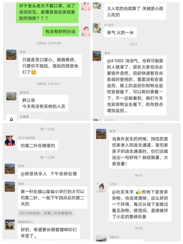 “您好,马上安排物业清理!”“您好,大厅是公共区域,禁止停放非机动车,请考虑下安全问题。”“现在正处在小区疫情防控封闭管控阶段,西门不能开放!”“下午四点钟可以在卫生院微信公众号预约。”……